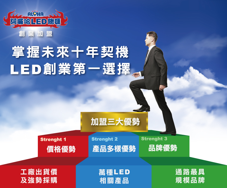 LED產品是世界性的產品,加上阿囉哈LED總匯擁有強力採購優勢、多年第一線市場經驗累積、及產品種累積已逾萬餘種加上新產品開發效率高,儼然已成為LED生活相關應用產品的通路第一品牌,基於以上種種優勢,我們推出了阿囉哈LED總匯加盟招商計畫,低加盟金,快速開店的模組化規劃,極具價值的開店經驗之教育訓練等等與低門檻創業條件,是您選擇創業開業的第一選擇。